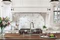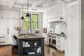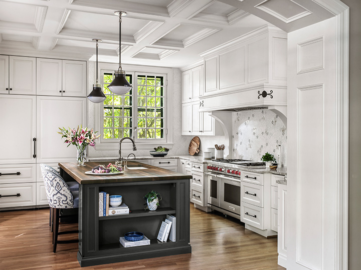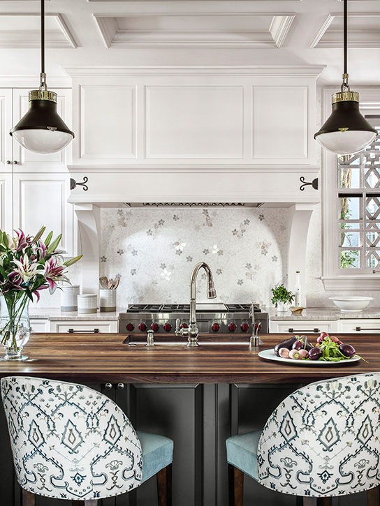This newly renovated kitchen is influenced by the elegance and charm of traditional American architecture. Designed by Castle Design and MDG Renovations, the kitchen features unique craftsmanship with raised-panel cabinetry, an intricate coffered ceiling and ironwork accents. Inspired by the home’s grand staircase, hand-forged iron brackets flank the custom built-in hood. Perfectly proportioned casework and cabinetry set the tone for the space. The design team was challenged to create a space that flowed nicely while also making the new kitchen feel more open. Double glass upper cabinets were designed to allow natural light to filter from the back foyer into the new kitchen making the space feel more open and connected. The backsplash below the hood is a delicate cherry tree design chosen to celebrate the gardens just outside the kitchen window. Dark bronze cabinetry hardware along with bronze pendant lights give an informal, industrial touch to juxtapose against the more elegant design features. The large center island showcases Grothouse walnut countertops, while the surrounding countertops are a polished Taj Mahal quartzite. The counter stools add a rich layering with intricately detailed embroidery by Colefax and Fowler. This new kitchen honors the formality of the home while also feeling fresh and approachable.