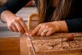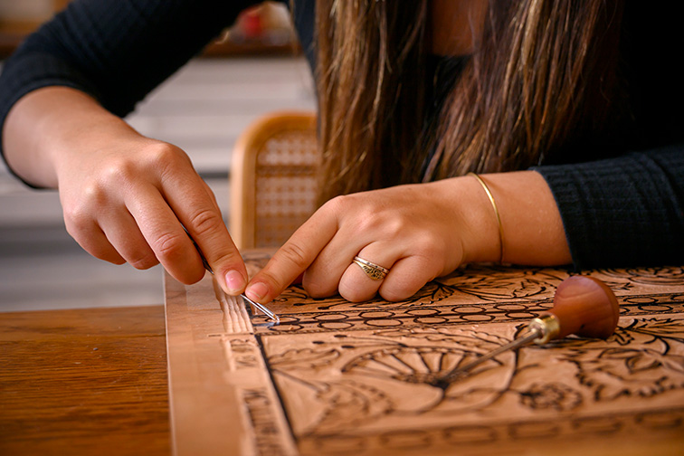 Her most recent project included carving a large, patterned woodblock used in the printmaking process. It’s long and tedious work for some, but she loves it. “I estimated the process to take about 30 hours and it ended up taking 45.” She adds, “Carving woodblocks is currently my favorite part of being part of Papillon Press. I love how part of my job is to get my hands a little dirty so that other people can have beautiful art in their homes.”