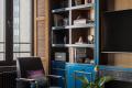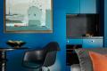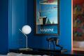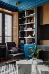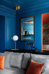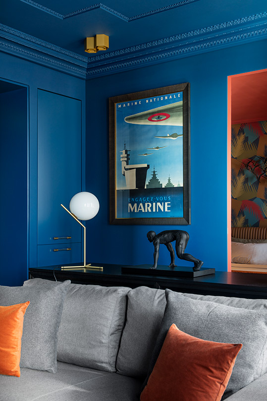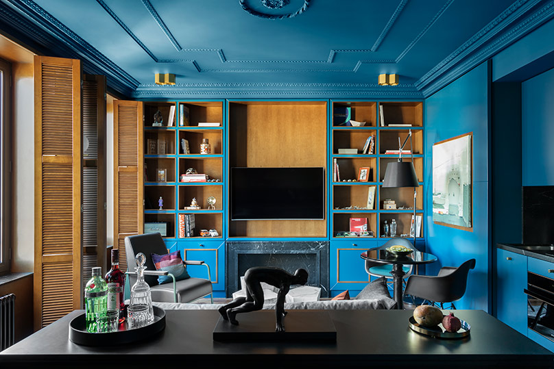 Daring color makes the space appear more voluminous, Petr says. Saturating the living room’s built-in cabinetry, walls and ceiling in a bold royal blue makes the interior seem monolithic, he says, “and helps bring a drop of extraordinary and add volume to the space.”