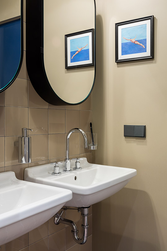 Eclectic furnishings combine both classic and modern styling, with a tilt toward mid-century modern. A prized example is a Jean Prouvé armchair by VITRA. Petr says VITRA made only five leather chairs in the color the designers own. “There is only one piece in Russia, which stands in this interior,” he says. The mid-century vibe is carried into the bathroom: twin, wall-mounted sinks and wall tiles with an industrial bent highlight the fuss-free space. The sink style was commonly found in European bathrooms in the 1950s and ‘60s, Petr says.