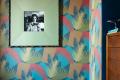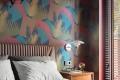 In their bedroom, a dramatic leaf-print wallpaper in shades of blue and terra cotta covers the headboard wall, with the ceiling painted in a complementary burnt orange hue. Louvered wood shutters here and in the living room add an organic element and control just the right amount of light for relaxation and rest.