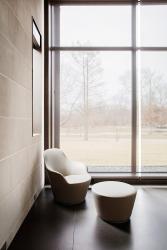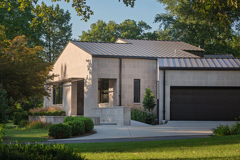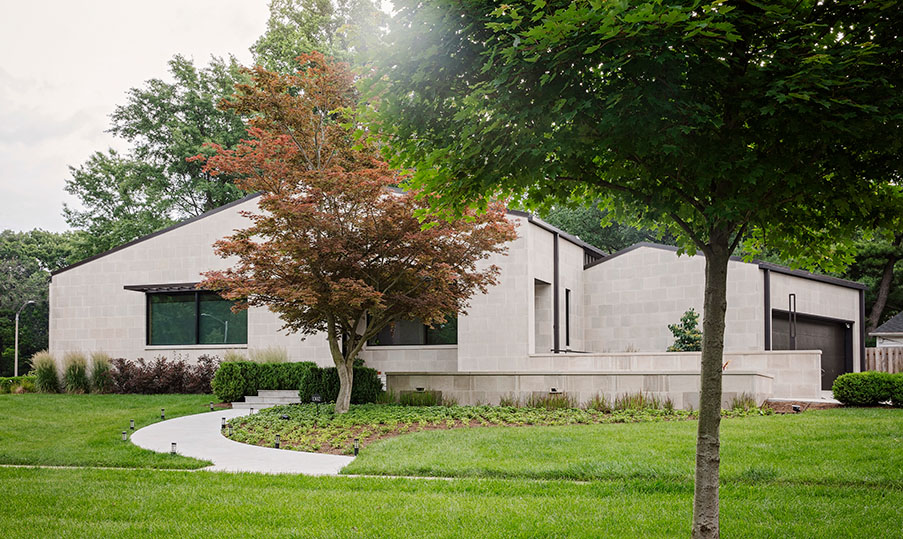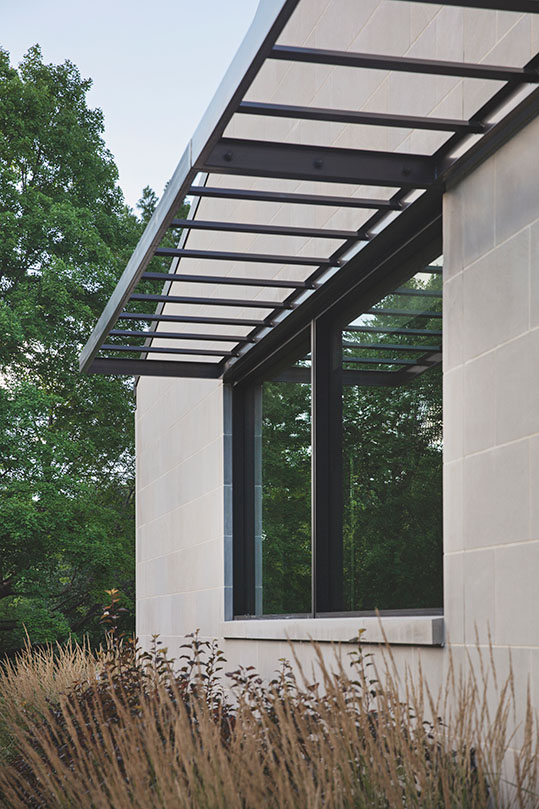 Clad with Indiana limestone, the exterior emanates a natural elegance while honoring a native material used throughout the region for its splendor and accessibility. Planted prairie grasses sway in the breeze, contributing to the aesthetic and simplicity of the landscape. “The property as a whole creates a healthy environment on the outside by extending the adjacent park,” Susan explains. “It enhances the well-being of the neighborhood with greenery and tree maintenance. On the interior, it captures views of the park for the inhabitants, increasing their well-being. The entire home’s collective accessibility enables greater flexibility of use.”