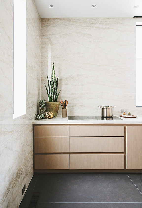 The original clients requested durable, low-maintenance materials that could be used both inside and out. A neutral palette throughout ensures a calming aura that blends with the surroundings. Combining architectural acumen with interior beauty, Susan’s material choices always consider form and function, fastidiously tailoring each project to the client’s specific needs. “Designed for eco-friendly sustainability, all systems in the house are energy efficient with excellent insulation values,” she adds. “The large thermal windows face north for consistent indirect light throughout the day.”