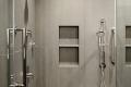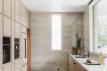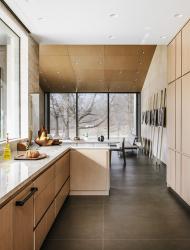 The living room’s expansive picture window gazes out to the park beyond, creating a spectacular panoramic view that’s also visible from the dining area and kitchen. A gorgeous stained-wood ceiling with recessed lighting brings warmth to the room’s stone walls and the kitchen’s resilient hard surfaces. In the mudroom, the designer created a convenient built-in drop zone for keys, bags and other essentials. Additional custom features include a built-in library display cabinet for family albums and collectibles. The cabinet provides a buffer that screens the guest room and office from a cocooning media area designed for home entertainment and lounging. In the primary suite, a light-filled corner with a cozy club chair and ottoman forms a quiet nook for reading and relaxing, and a sleek state-of-the-art bathroom with a built-in bench, shelves and grab rails emits a serene spa-like ambiance.