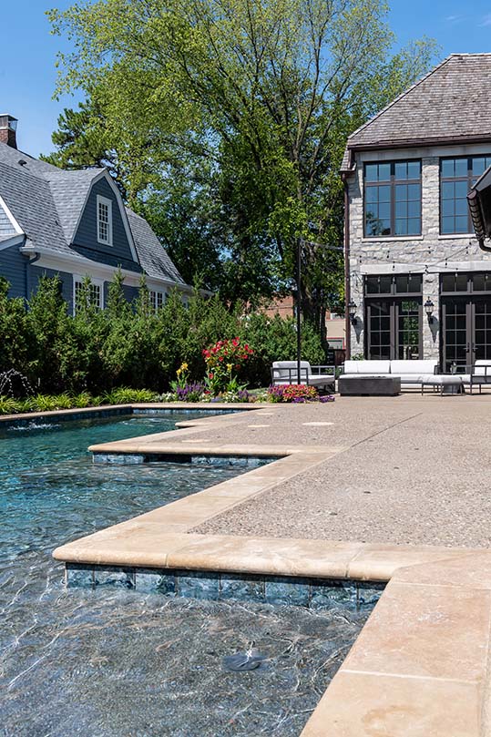 A geometric-shaped pool that reflected the architecture of the home and also integrated well with the overall landscape and fit into a small footprint was the main objective for this pool project. The homeowners worked with The Pool Specialists to create a summer splash spot that would include a section for lap swimming, an area for socializing and a tanning shelf where their small grandchildren could play safely. The unique shape also allowed plenty of room for patio furniture and circulation space on the patio. The surface materials chosen have a stone grotto-like appearance that blends seamlessly with the pool deck, stone wall and home. The homeowners love how calm the entire pool looks.