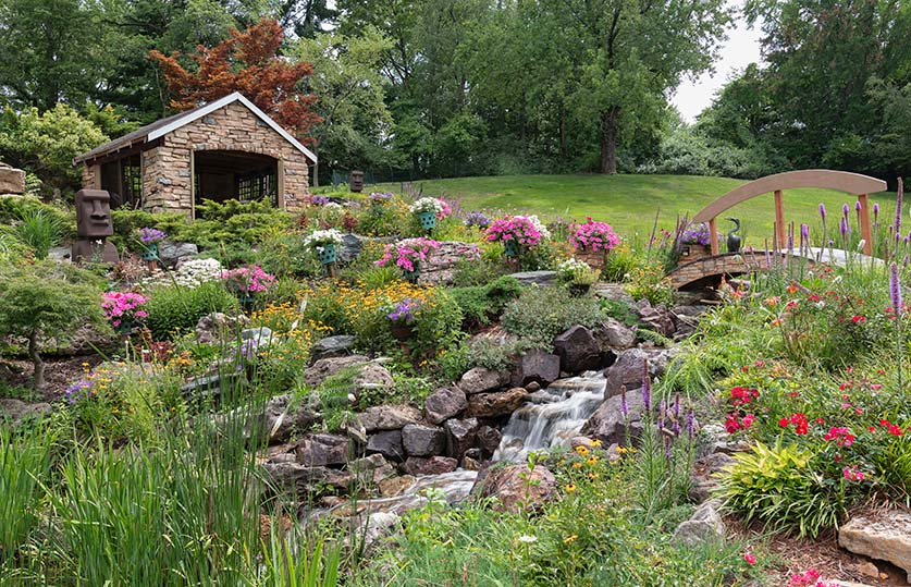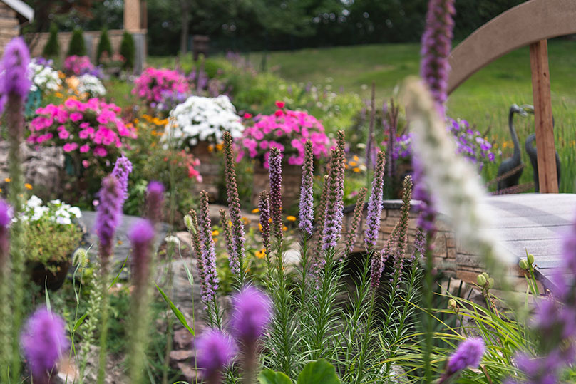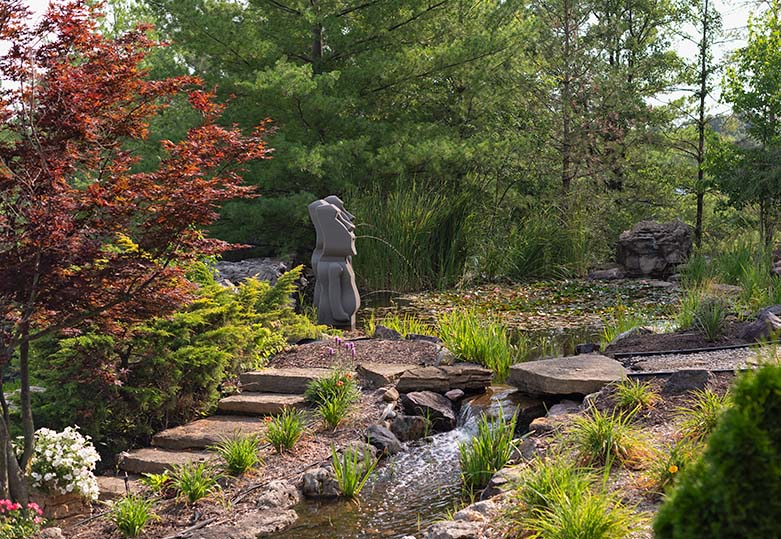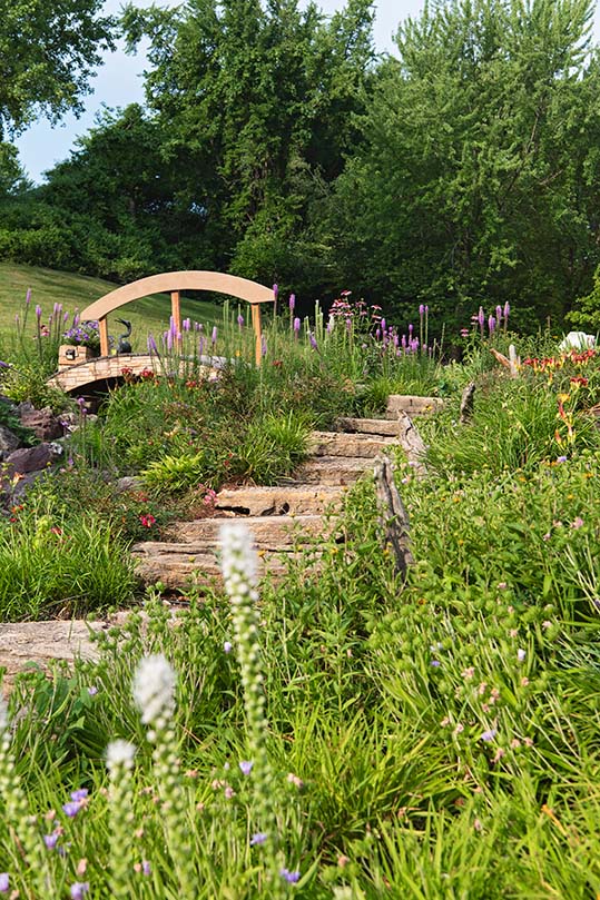 Rod also is hands on when it comes to landscaping his huge water feature. “I don’t go in for a lot of exotic plants,” he says. “I want things that are really solid and proven to do well. Perennials include natives such as purple and white liatris, yellow and purple coneflowers, Queen Anne’s lace, and blue-purple stokesia. Hostas and daylilies also are favorites. Grasses dot the landscape and provide contrast.
