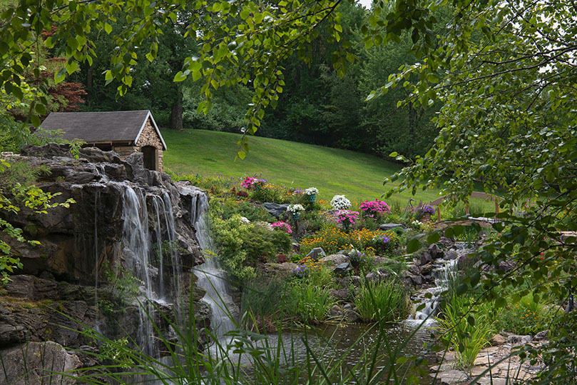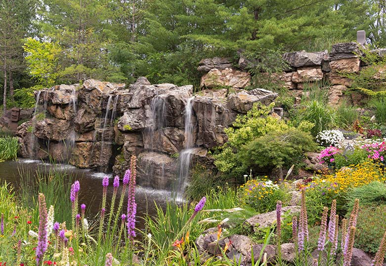Molded off natural stone, the cliff is actually three massive, factory created sections brought in on flatbed trucks. Because of the light weight of the artificial rock, two concrete retaining walls first needed to be installed to hold the hillside in place. Overall, the initial installation took two years to complete. To keep the waterfall and streams going requires four pumps, two for the waterfall and two for the streams. “It’s been here for 24 years. It’s proved to be long-term technology,” Rod notes, regarding the durability of the artificial rock. “I had a lot of fun doing this. People come in and they say, ‘Where did you get all that stone?’”