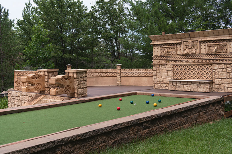 When he wanted to add a bocce ball court at the top of the slope in 2021, he decided creating a Mayan-ruin-themed space would “take a plain playing court to the next level. I had visited a number of Mayan locations in Mexico and Belize, so I designed it primarily around Chichen Itza along with some elements based on two other locations.” Rod explains. Having a themed attraction, complete with Mayan glyphs of eagles and jaguars, at the top of the slope, he knew would be a way to get garden visitors to climb the hill and to experience the entire landscape.