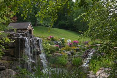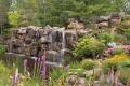 If it would work for those folks, why wouldn’t his patented artificial rock technology translate into a wonderful water feature in his own backyard, he reasoned. Rod called on John Saul of Saul’s Custom Designs/Design Reflections, the Aquatic Source to provide the water garden expertise. The two laid out a plan, creating two, long, cascading streams, ponds at three different levels and two 60-foot-wide, 12-foot-high cliff-like waterfalls, all incorporated into a 30-foot drop in the back yard. While natural rock is used for the streams, stepping stones and pathways, the cliff-like waterfall is artificial stone.