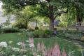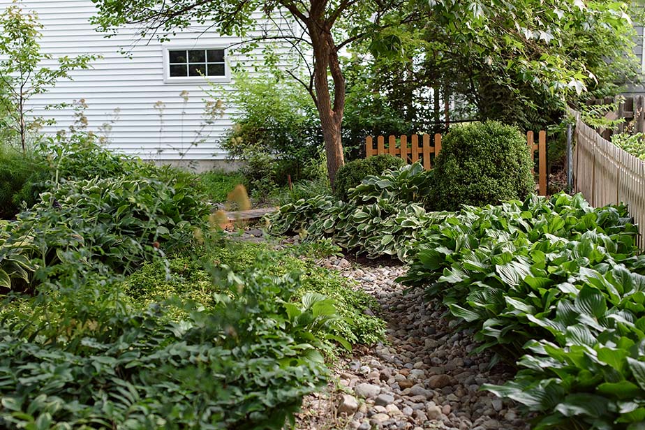 Around the back, Fred created beds circling the perimeter of the yard and flagstone pathways to get from one area to another. Under the sweetgum tree, boxwoods, hydrangeas, variegated Solomon’s seal and chartreuse-leaved ‘Sun King’ aralia have joined the original hostas.