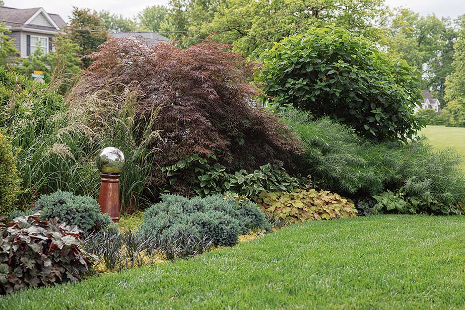 Tiny ‘Anna’s Magic Ball’ arborvitae, ‘Candy Corn’ spirea and variety of soft grasses now augment the original cranesbill and epimedium along the front walk. The colorful leaves of heuchera or coral bells and feathery stems of blue star amsonia add accents to a front border anchored with hydrangeas, boxwoods, crepe myrtle and feather reed grass. Bronze-leaved begonias with bright red-orange flowers provide continual pops of color and tie the beds together.