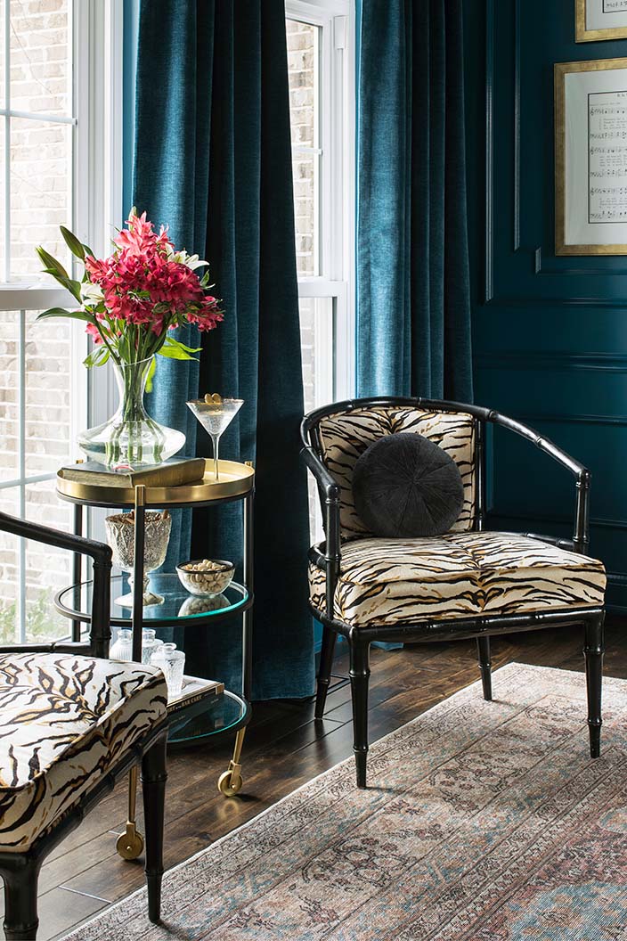 At The Refind Room in Brentwood, Ellie found two unique chairs covered with zebra print fabric. She had thought about recovering them and using them in a different room, but realized they would look perfect as is in the music room. “That was a fun find for me,” she says. “It’s showing how you can and should mix new with old, and make it come together in a more current way.”