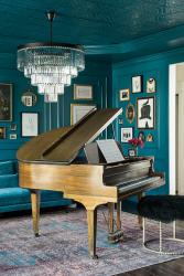 She had drapery made in the same teal, and added a matching teal sofa. They moved the piano that their 15-year-old son Max uses from the great room into the music room.