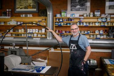 Art can take on many different approaches and styles. Ken Wood, an artist and professor at St. Louis Community College, combines relief printmaking, the more traditional process of printing, and collagraph printing, a process in which glue and fabric are used to add texture to a print. The end result under Wood’s artistic eye is a smattering of colorful shapes swirling across a white background.
