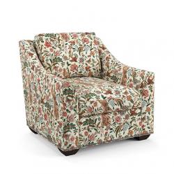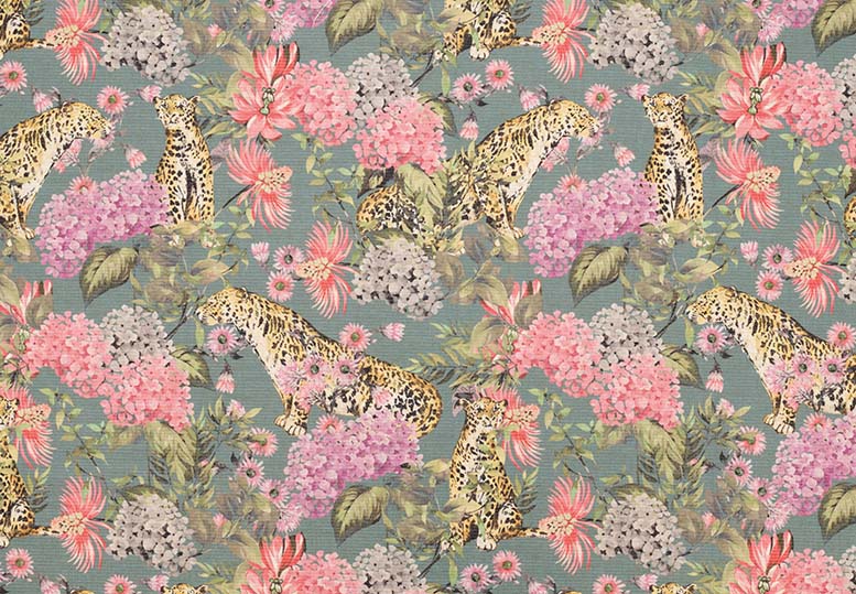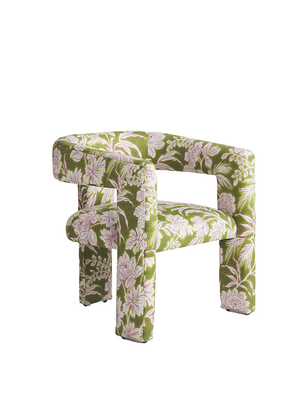 Kelsey chair in floral printed fabric and saxon bench in green animal pattern fabric, available at Design & Detail.