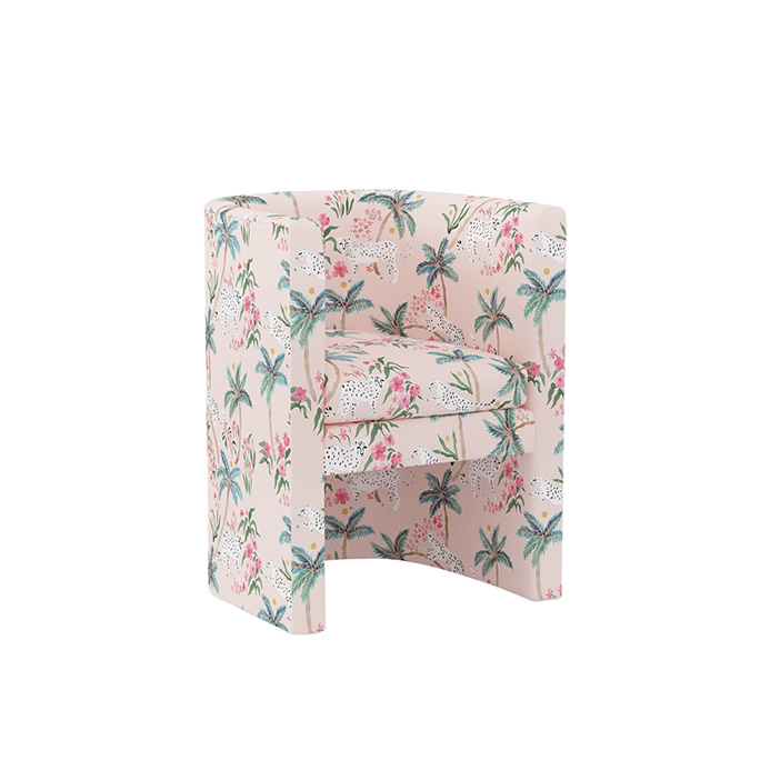 Modern rounded upholstered back chair in palm leopard blush, available at West Elm.