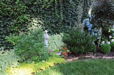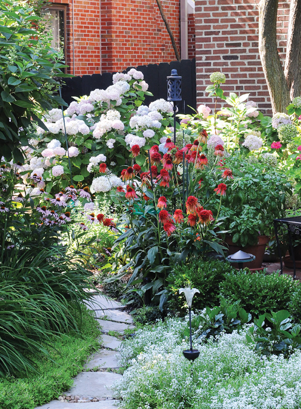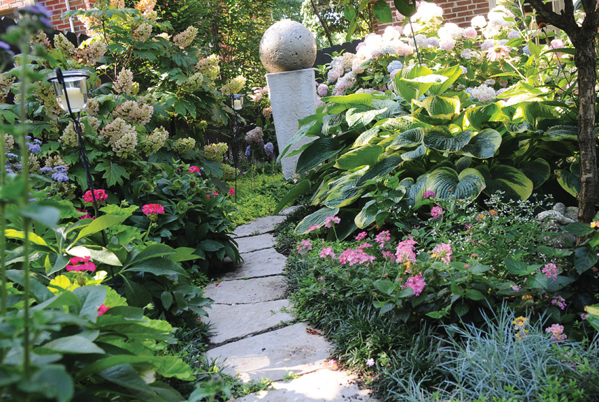 As time went on, Carol added stepping stone pathways, a sculptural fountain, an arbor and finally a Fond du Lac stone walkway from the front steps of the house to the back garden gate. Privacy fencing softened by shrubs and flowering vines keeps the garden secluded and calm. The space is small enough that each tree, shrub and vine can draw individual attention from both Carol and garden visitors. She is quick to point out the serviceberry, tri-colored beech, topiary holly, miniature crab apple and “dear little Korean lilac.” She delights in trying and pointing out new plants such as a shade-loving aucuba, with its evergreen yellow speckled green leaves that will thrive in a protected spot in St. Louis gardens; an akebia, also known as a white flowering chocolate vine; and a double, fiery orange coneflower called ‘Hot Papaya.’ The addition of watering and lighting systems keeps the garden refreshed during the day and luminous at night.
