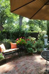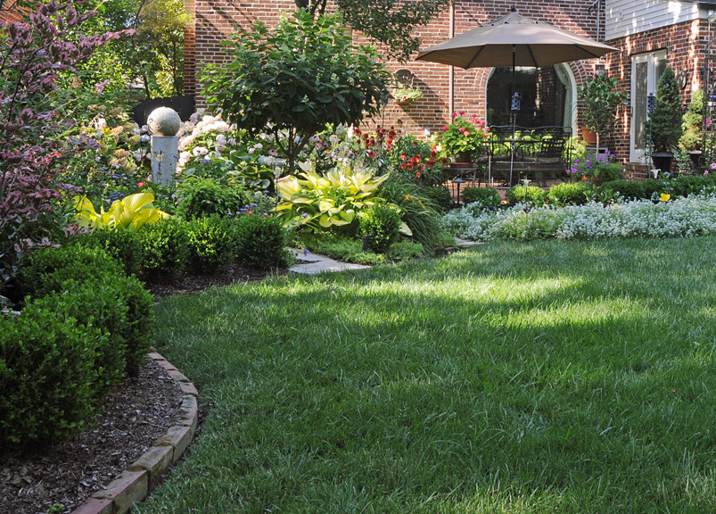 The garden design is her own. She began by filling in the center of a circular brick patio at the back of the house that had contained a birdbath and pachysandra. From there she worked to give the garden graceful, curving lines by outlining shapes with a garden hose and eventually defining those arcs with brick edging and small evergreen boxwoods, determined to make the space as attractive in the winter as it was in spring, summer and fall.