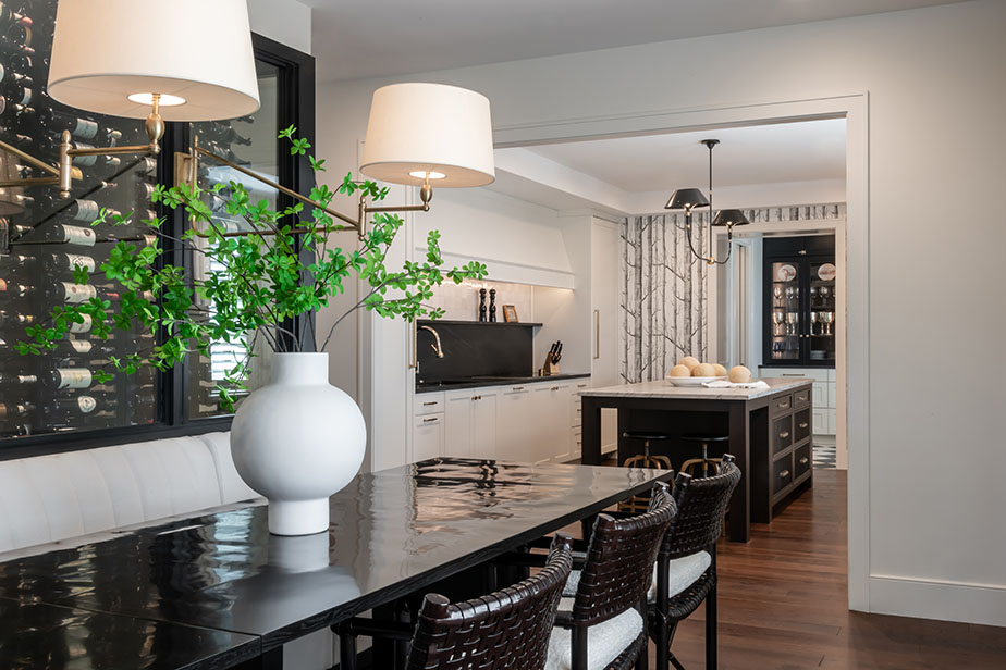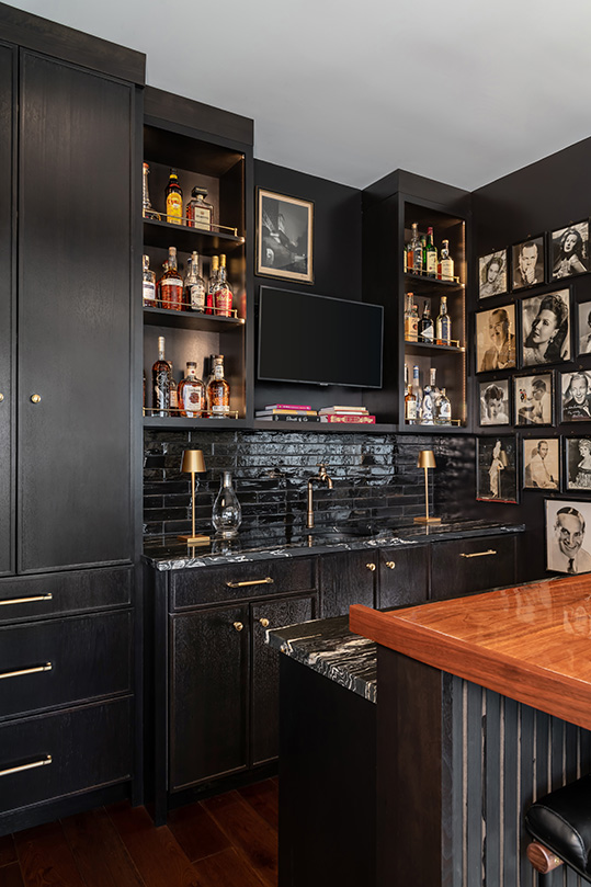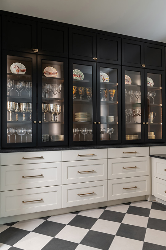 Drawing up detailed cabinetry plans and perspectives was part of the process, as were job site visits to check installation after ordering, Louis says. “The kitchen island was not only a different cabinet construct from the perimeter, but we used a stain on maple,” Louis says. “We then took a slightly lighter version of that stain to do the interiors of the glass front butler cabinetry, which is matte black uppers over white bases.”