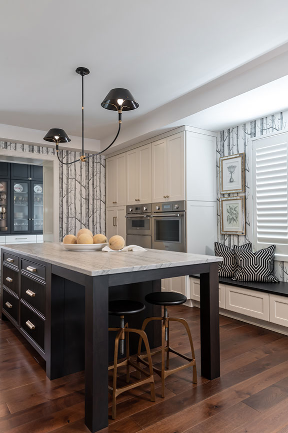 She chose a wallpaper illustrating trees in black, white and gray for the kitchen walls. “Living in a condo, I wanted to bring some ‘nature’ into the space,” she says. She had used the wallpaper in the powder room of a previous condo she’d decorated and lived in, and loved it. “It just felt right to give it a little more presence as well as some ‘movement’ in the kitchen,” she says.