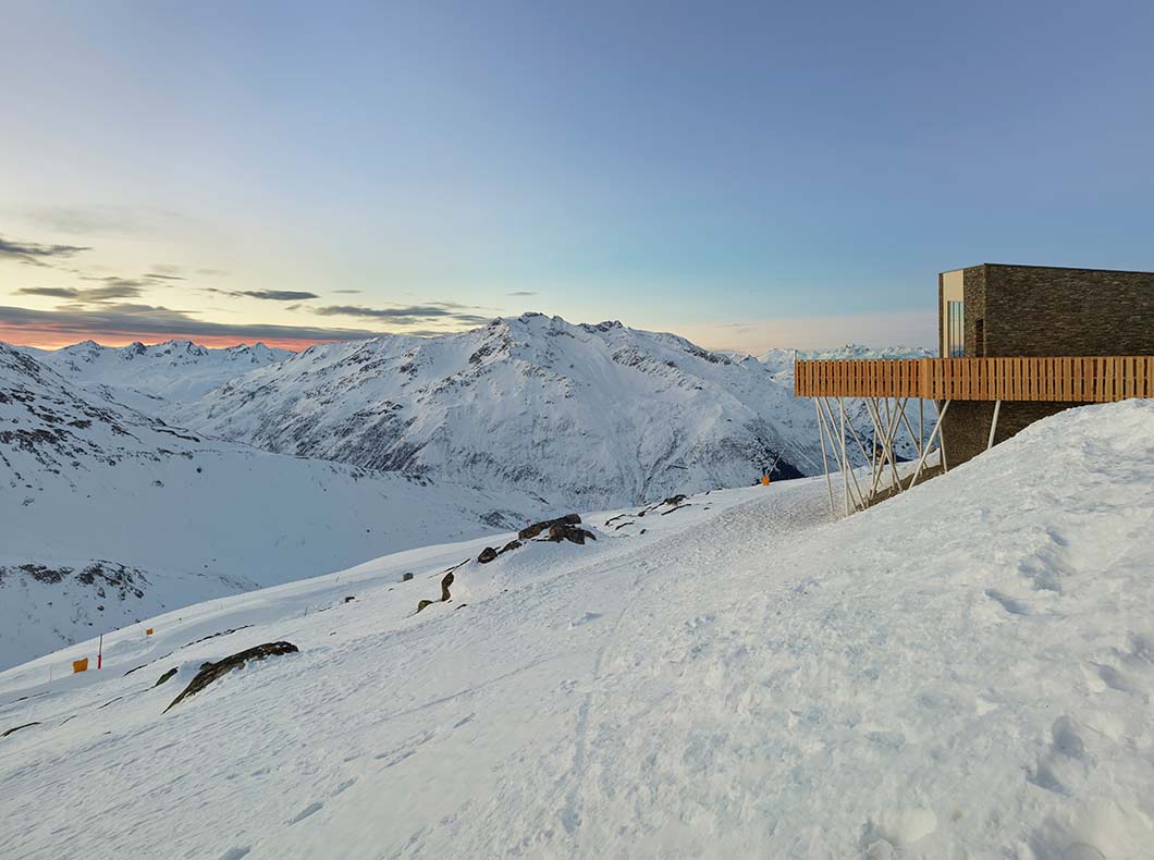 Since the restaurant building is set on a steep incline, many precautions were taken during the design and construction. To adapt to the steepness of the site, solid stone volumes, like the ones that anchor the balconies, are anchored into the ground. In addition to this, the base of the building is made of concrete foundations and base. “The roof structure is unique to each volume and follows the diagonal slope of the buildings,” says Studio Seilern Architects. Indoors, a series of beams stretch across each volume and serve as a defining characteristic of each dining space. On the exterior, the building is covered in natural stone, typical for Swiss buildings at this altitude. The stone helps the buildings weather excessive wind, frost, ice and snow. “We surveyed the local stone and masonry walls built by the army over the years and wanted to adopt the same language, of a material sourced from the site, as if it was always meant to be there,” mentions Studio Seilern Architects.