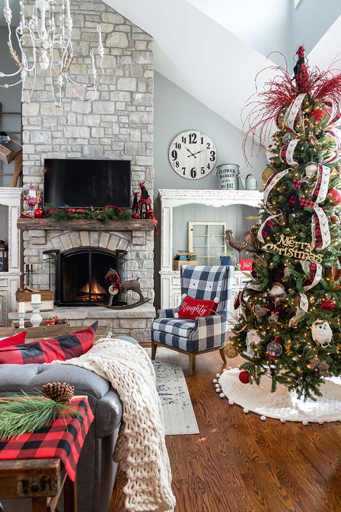 Her more traditional, red, green and gold themed holiday tree encompassed owls, Santas and pine cones, surrounded by red-and-black plaid ribbons, scarves, pillows and table runner.