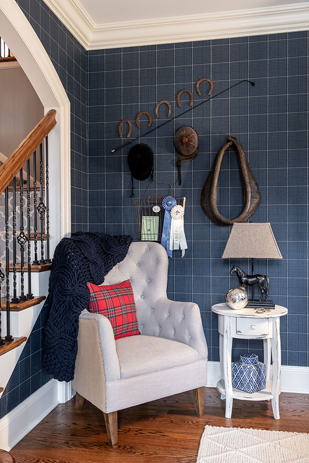 Additionally, she says she embellishes a corner reading chair area with authentic horse items, many from her Grandmother Dolores’ equestrian days, along with a festive pillow, throw and oversized silver ornament.