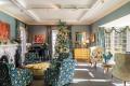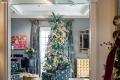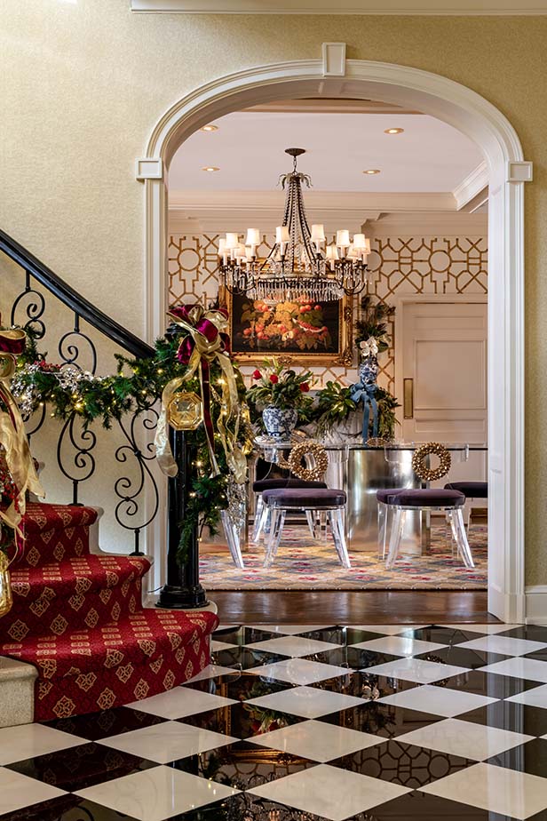The formality of the furnishings—winged chairs, an ebony baby grand piano, a fringed cloverleaf ottoman—take cues from the ornate marble fireplace, adorned with frescoes and original to the home. For the holiday tour, a Christmas tree decked in peacock shades of blues and greens adds festive fun to the space. “I always have a peacock tree,” says the wife. “My grandmother raised peacocks.” This tree and the garland on the fireplace mantel also held oversized gemstone-like ornaments in bright jewel tones, a suggestion from floral designer and noted Christmas décor aficionado Dave Zettler.