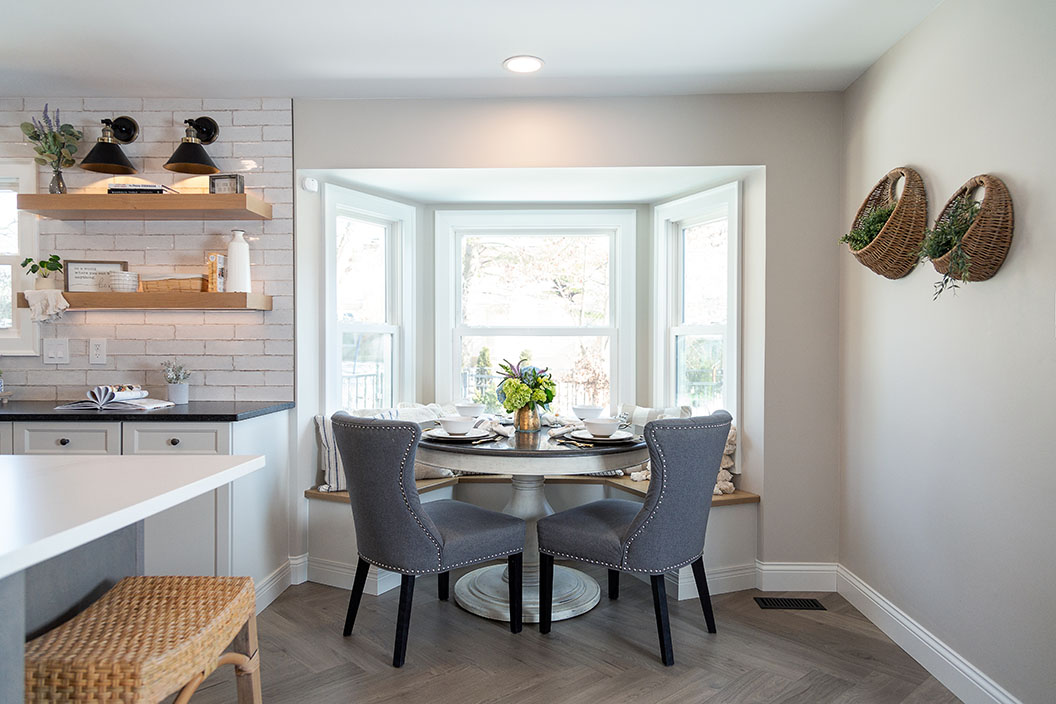 By Anne Marie Design Studio. Where our client desired a separate seating option from the island, this home already had the perfect bay window we could utilize for such a bespoke seating space! We built a banquette bench seat to take the shape of the bay with windows, which in turn is a perfect fit for a 42” round table. Optional chairs complete this look. Photography by Nicole Miget Photography.