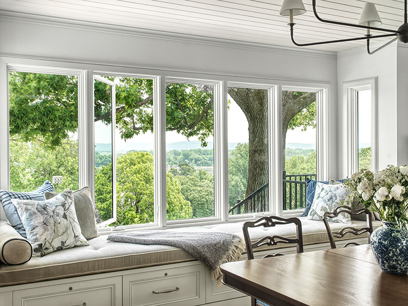 By Chelsea Design Company. This breakfast nook was a part of a large L-shaped space with three seating areas and a kitchen. We added a 12-foot window seat with a single cushion in a durable seafoam faux velvet, which sat between the main 8-foot dining table and a stunning view of rolling hills and the Mississippi River. We wanted to accentuate the view, not interrupt it, so we chose neutral and complementary materials and hung the oversized chandelier close to the ceiling. Photography by Alise O’Brien Photography.