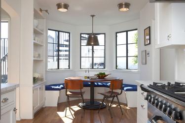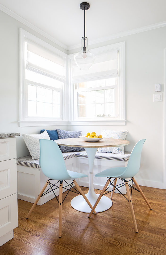 By Larina Kase Interior Design. This nook is in the kitchen of an older home where we combined traditional and mid-century modern styles. The goal was to maximize the usage of space and create a cozy spot in the sun for the family to enjoy their breakfast. Photography by Aliza Schlabach Photography.