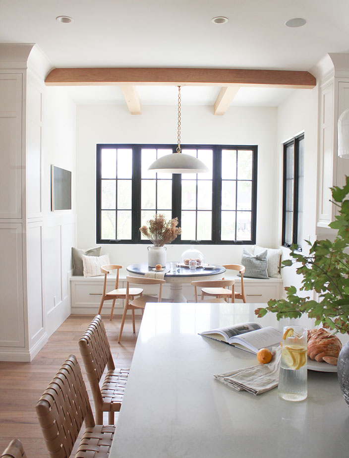By Stephanie Pohlman Designs. Upgrading your kitchen with a designated breakfast nook adds value to your home and creates a multipurpose space for gathering that isn’t limited to mealtime. In this custom build, we incorporated a bench with added seating and storage. My favorite part has to be the windows and natural light paired with the natural wood beams creating a cozy retreat that sets itself apart from the main kitchen area. Photography by Lisa Mitchell.