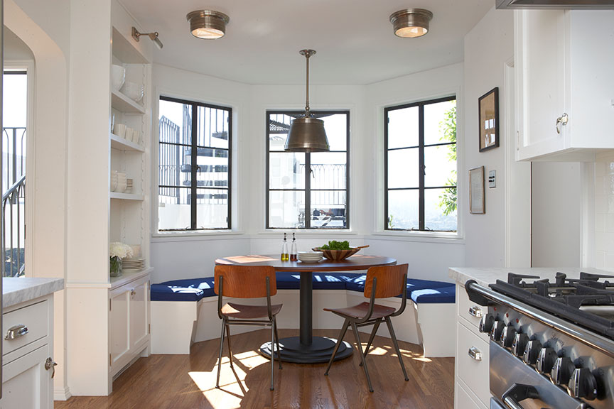 By Tim Barber Architects. In the historic Wolf’s Lair chateau near the Hollywood Sign in Los Angeles, Tim Barber Architects created an entirely new kitchen for songwriter Moby. Traditional cabinetry, hardware and lighting define this sunny breakfast nook; steel windows frame the canyon views beyond. Photography by Noah Webb.