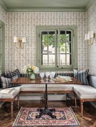By Castle Design. Part of a renovation for a fun-loving family’s historical and stately home, this breakfast nook sought to be both a thoughtful extension of the kitchen where family and guests can overflow and a cozy breakfast nook for a quiet cup of coffee. Incorporating peaceful pattern play and classic colors in the Lisa Fine wallcovering, Carolina Irving banquette fabric, custom walnut table and Visual Comfort lighting, this breakfast nook is a perfect addition to this grand home. This effort was in partnership with Stone Hall Cabinetry and Period Restoration. Photography by Alise O’Brien Photography.