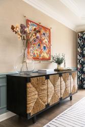 Instead of doing tailored dining room window treatments, Diane says they created a wall of fabric to highlight the pattern play and color. “It softens the space while also being functional. I also love the framed, vintage Hermès scarf that complements the vibrant color highlighted in the other fabrics. The use of texture as seen in the velvet seats and the rattan front sideboard brings dimension to the space as well.”