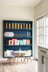 A children’s nook in the kitchen was created in front of a display wall. Diane says, “This custom gallery shelving provides the perfect spot for cookbooks, kids’ artwork, books, pasta and more. The ideas are endless for using this space.”