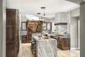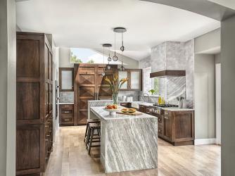 These homeowners were looking for a contemporary design that felt modern and clean. Chelsea Design Company began the transformation by upgrading the refrigerators and upgrading the previous dividing peninsula into a long island. To create a focal point, a panel ready column refrigerator and freezers were enhanced with diamond panels to catch the natural light. New white oak floors, a rich dark walnut shaker-style cabinet and a contrasting neutral painted cabinet on the two-tier island adds a touch of nature. Fantasy brown marble surrounds the room with two waterfall edges on the island and a full-height backsplash.