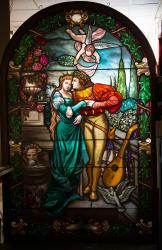 Once a design is finalized, the types of glass available are discussed, such as color or opalescent glass, bevels, jewels, etc. The pattern is then cut into the different shapes and later the glass itself. The next step is to piece everything together. “It’s like putting a puzzle together,” Jerry says. The window gets glazed with lead to make it solid and is then waterproofed. The final step is to install the window.