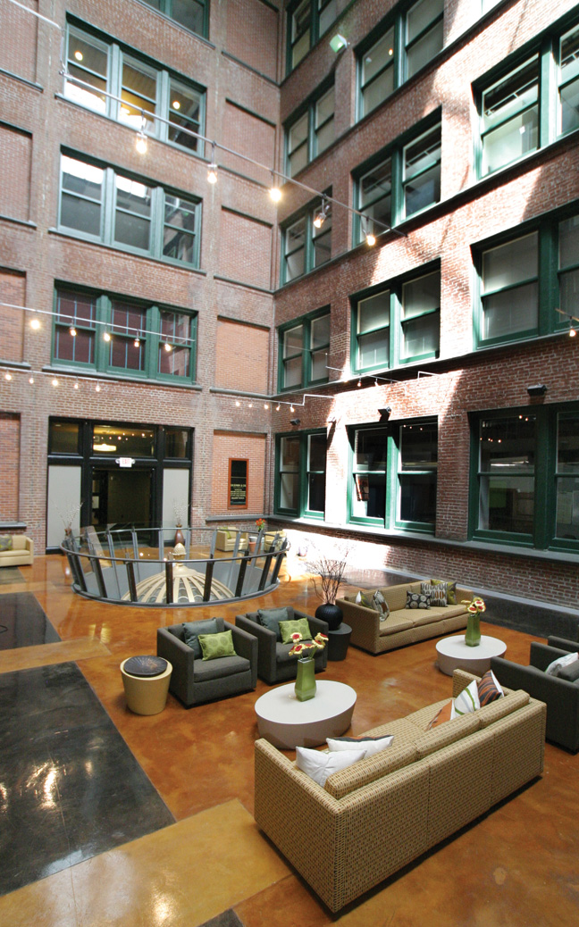 The Security Building is the first historic building in Missouri to receive LEED Silver certification. Originally designed by the renowned firm of Peabody, Stearns and Furber, the 117,000-square-foot structure was renovated by The Lawrence Group. The Lawrence Group provided architectural, interior design and development and construction services. The six-level atrium addition above the domed lobby entrance was the centerpiece of the building. The Lawrence Group saved energy by creating an atrium within the natural space formed by the U-shaped building, making interior walls of the buildings’ original exterior. The Lawrence Group removed years of thick black coating on a dramatic glass dome ceiling in the lobby, creating a skylight above the atrium that lets natural light spill into the lobby.