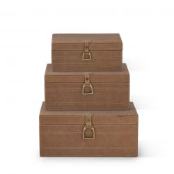 Stirrup latched tan leather boxes, available at Blue Dahlia Designs.