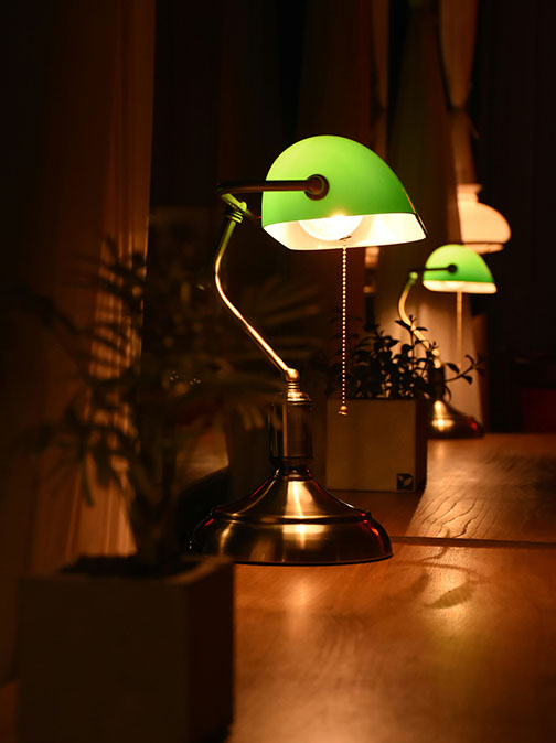 The first patent for the Bankers Lamp was issued in 1909 to Harrison Dawson McFaddin, they were then manufactured by J. Schreiber & Neffen who only made the green lampshades for H.G. McFaddin & Co. Originally called the Emeralite, the lamp’s simple design consisted of a brass base and a green-over-white cased glass shade. The iconic shade was formed by fusing an inner white opal glass with an outer green glass layer. The Emeralite was then adopted by several financial institutions, earning its name of The Bankers Lamp.