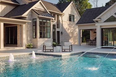 Although the outdoor spaces are large, they mesh seamlessly with the interior of the home. Just stepping through the front door, a visitor immediately has views through the home to an outdoor terrace and the pool beyond. Drew worked with interior designer Leslie Cusanelli of Milieu to ensure that the pool tile and finishes blended with those on the interior of the home. Laminars shoot arching jets of water from the pool deck into the pool itself and echo the soaring ceiling of the great room. They provide a dramatic architectural element, clearly visible from the house, particularly when the laminars are lighted at night.
