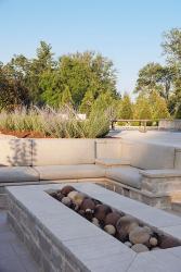 Mindful of the homeowners desire for a clean look and low maintenance, he carefully selected trees, shrubs and perennials with specific architectural shapes and sizes that would fit the landscape with minimal need for pruning and shaping. He also looked to varieties that would add year-round color and movement to the landscape without overwhelming the neutral palette the homeowners preferred. Grasses and perennials that might appear messy at ground level are concealed behind a “fence” of evergreen boxwood. Rather than using a vast number of different plants, Tony focused on varieties with a track record of thriving in a variety of conditions and used them throughout the landscape to make the spaces cohesive and blend together.