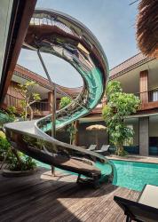 At the center of the home, an open area holds a small pool and accompanying slide. “Beyond its functional purpose,” says Alexis Dornier, “the slide serves as a symbol of playfulness, encouraging interaction and evoking a sense of fun and curiosity.” This unique fixture amplifies the creative energy of the space. Dark wood floors, an intricate handrail and multiple sets of comfy lounge chairs with umbrellas adorn the lower level. Lush interior landscaping provides shade for those lounging by the pool, and additional seating can be found under the protection of the second level’s overhang. Each detail is expertly curated to enhance the inhabitant's experience. Even the handrail system which “with its flowing, conveyor-belt-like design, amplifies the energy of the void.”