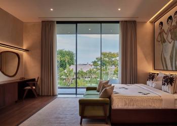 Designed to celebrate playfulness and movement, the Akashi Residence is a six-bedroom home where modern architecture and creative design choices combine to emit a bold and airy feel. Set within the backdrop of Bali’s tropical surroundings, the home’s indoor/outdoor balance ties its design to the local environment. The architects found inspiration in the idea of the home existing in conversation with its inhabitants, utilizing open circulation and an airy layout to convey this theme. “The void evokes a feeling of being within a whirlwind, where movement and light dance across the architectural surfaces, heightening the sensory experience of the space,” says Alexis Dornier.