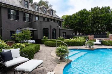 When it came to furnishing the space, Sarah knew she wanted a mix of modern and eclectic to make it feel like theirs. “We updated the area with a curated mix of contemporary pieces from CB2 and Williams Sonoma,” she mentions. “We love blending modern elements with subtle traditional touches to create a space that feels fresh yet timeless.” Comfortable, wide lounge chairs circle the pool, complete with white cushions and black outdoor pillows. A long outdoor dining table with an umbrella provides an additional gathering space, and carefully trimmed hedges and blooming hydrangeas add greenery to the paved areas.