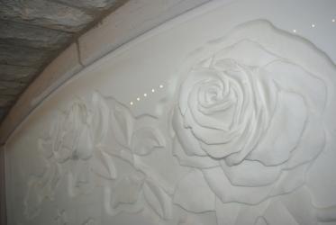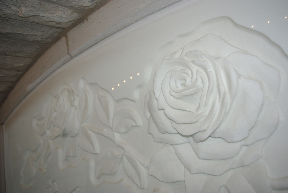 Milk glass rose carving. Abraham Mohler created the custom carving with innovative material and technique. Cut from 1 ¼” milk glass, the carving is sandblasted and sculpted with diamond abrasives. The glass piece is strategically placed at the rear wall of the stairwell and is also visible from the foyer.