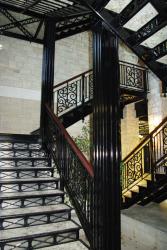 Stairwell. The custom-crafted stairwell runs from the lower level to the third-floor tower. Standing 34’ tall, the stairwell contains four fluted steel columns for support. The eight stair runs, which include the risers and railings, are made from 100 percent recycled ornamental iron custom designed by Eureka Forge. Granite stair treads and landings are polished on the top and bottom and are 1 ¼” thick.