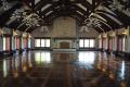 Ballroom. An expansive ballroom, measuring 40’ wide and 55’ long, is the focal point of the main level of the home. Arched mahogany trusses adorn the steel roof framing. Bamboo inlays accent the rich walnut wood floor. The ballroom’s column bases conceal speakers and are covered with ornamental ironwork in the form of a rose. At the far end of the room, a 12’ wide granite and stone fireplace features custom carved granite corbels.