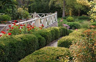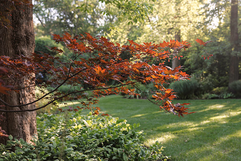 For the bones of her garden in addition to boxwoods, Natasha has learned to rely on Midwest natives. Masses of ‘Annabelle’ hydrangeas, with their dome-shaped white blossoms in early summer turning eventually to chartreuse, cascade down a hillside leading from the house to a creek that runs along the back one-third of the property. Stretching along the creek, soft, 3-foot-tall pillows of feathery blue star or Amsonia hubrichtii sway in the slightest breeze. Along with the movement it adds to the garden, the amsonia, sports clusters of star-shaped blue blossoms in early summer and turns bright gold in autumn.